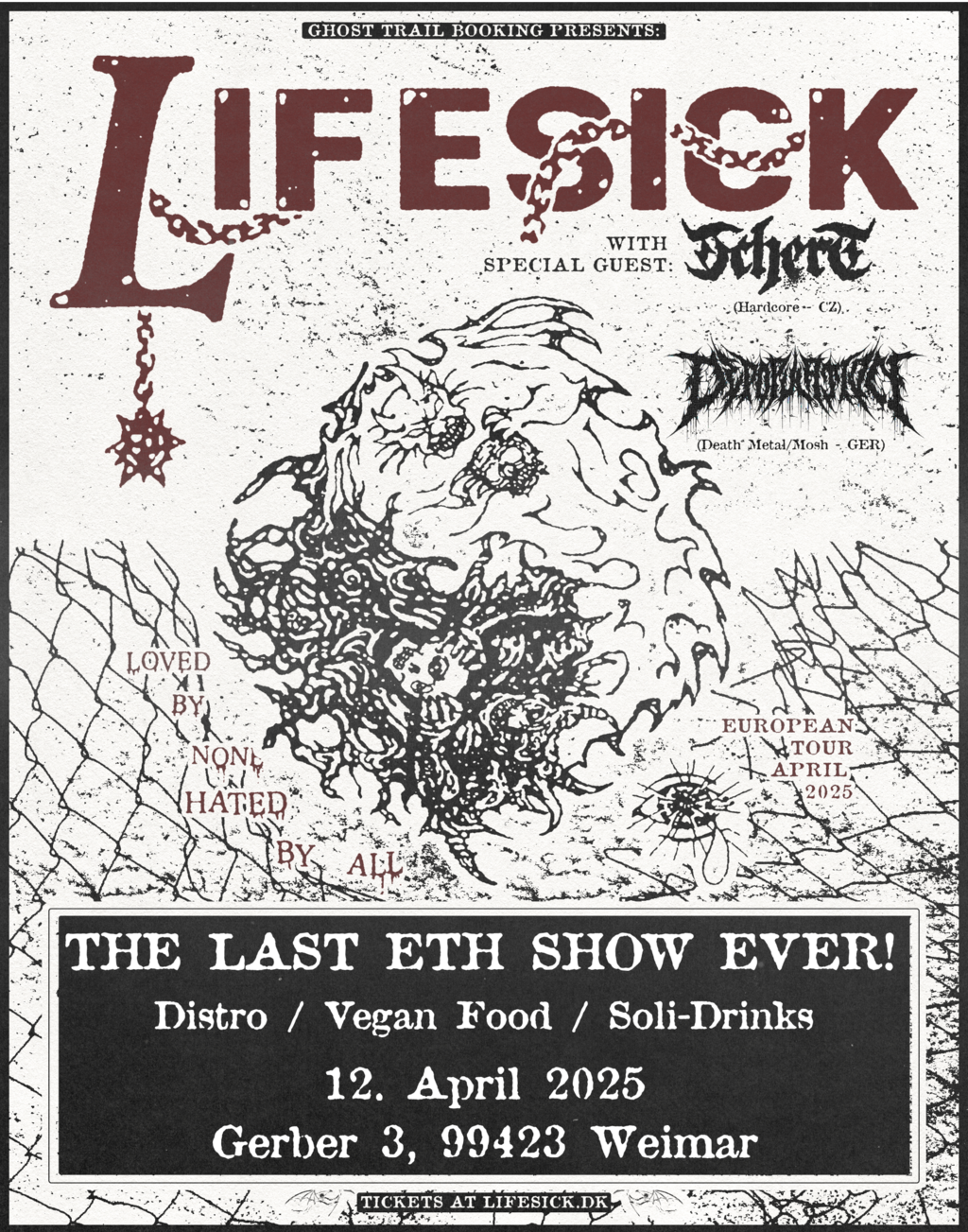 Die letzte ETH Show in der Gerber steht an. Zu diesem Anlass haben wir die dänische Metallic HC Band LIFESICK und die tschechische groovy HC Combo TCHERT zu uns verfrachtet. Als Support gibt es uga uga Death Metal von DEPOPULATION ausm Westen.