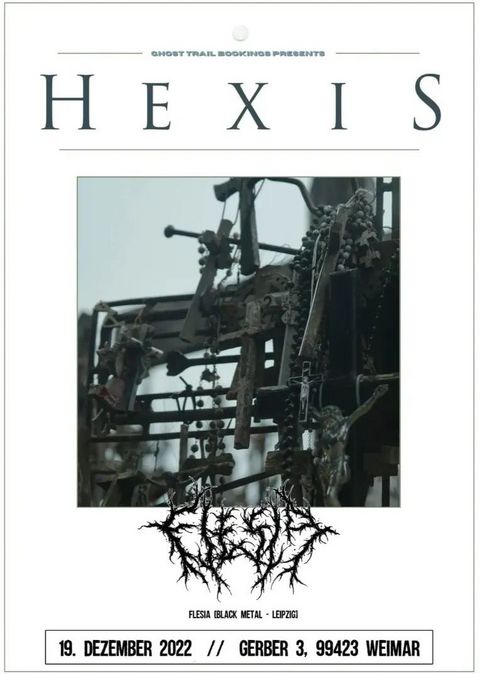 Für unsere letzte Show im Kalenderjahr, haben wir endlich wieder unsere Lieblingsdänen von HEXIS in die Gerber holen können. Zur Band selbst muss man wohl kaum noch Worte verlieren, allein schon weil sie nicht zum ersten Mal bei uns spielen. Natürlich haben sie ihr neues Album 'Aeternum' im Gepäck, welches sie auch komplett live präsentieren werden. Support macht die Leipziger Black Metal Band FLESIA, deren erstes und bisher einziges Album 'Trost' letztes Jahr im deutschen Untergrund für Furore gesorgt hat.