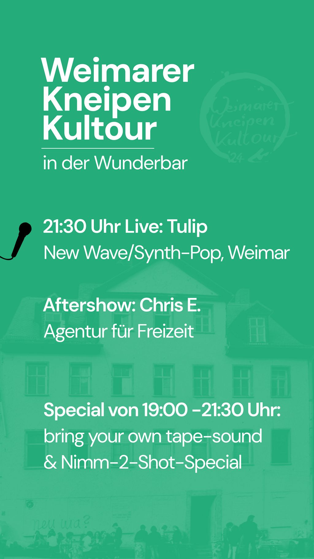 Die Weimarer Kneipen-Kultour findet am 08. Juni 2024 statt. Start ist 19 Uhr, der Eintritt ist frei!