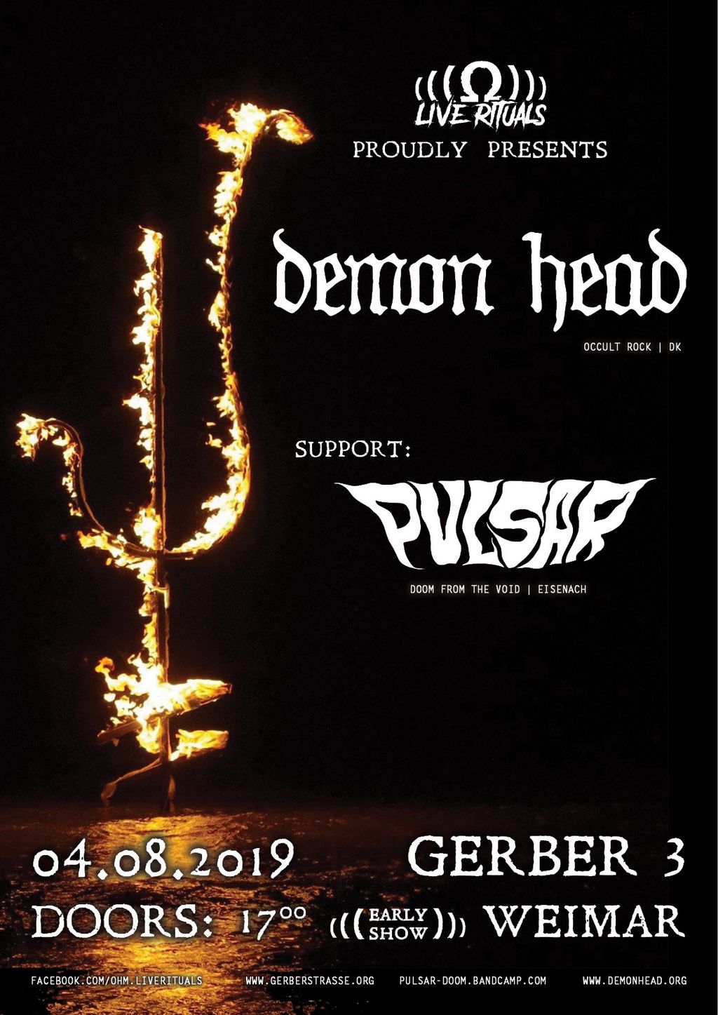 Als Opener stoßen Pulsar aus Eisenach dazu! Der ein oder andere hat sie im vergangenen November vielleicht schon bei unserer Geburtstagsshow mit Nekromant und Moon Shepherd gesehen. Alle anderen können dreckigen und recht flotten Doom erwarten. Seit der Show haben sie noch eine 3-Track EP auf Kassette rausgebracht, von der sie sicherlich noch ein paar Restexemplare am Start haben werden!