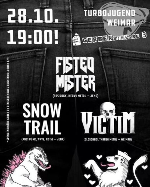 Mit unseren Freunden von der Turbojugend Weimar werden wir an diesem Abend ein Soli-Konzert mit kleiner Aftershow präsentieren. Neben den Bands wird es verschiedene Soli-Überraschungen geben, deren gesamter Erlös dem Gedenkweg Buchenwald e.V. zu Gute kommen wird. Das Gleiche passiert natürlich auch mit dem Geld aus unserer Spendendose und dem was bei unserem Soli-Schnaps rumkommt. Wir sind uns sicher, dass das ne super Party wird und hoffen ihr erscheint zahlreich, durstig und in Feierlaune.